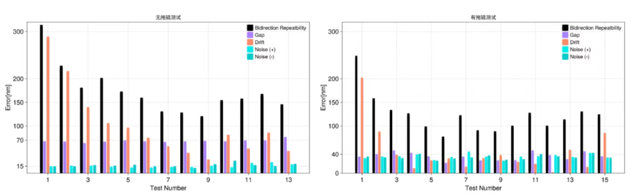 有拖链和无拖链的典型测试数据如图 7 所示,在有拖链情况下呈明显的波浪形式,而无拖链情况下呈线性形式。对测试数据进行对比,无拖链情况下Noise约为±15nm,而有拖链情况下Noise约为±40nm,数值明显增大,因此对有超高重复定位精度需求的运动平台,拖链的扰动不可忽略。