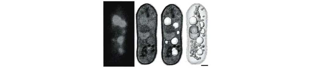 图6:酵母细胞液泡的冷冻荧光和对应的软X射线断层重构和分割渲染效果