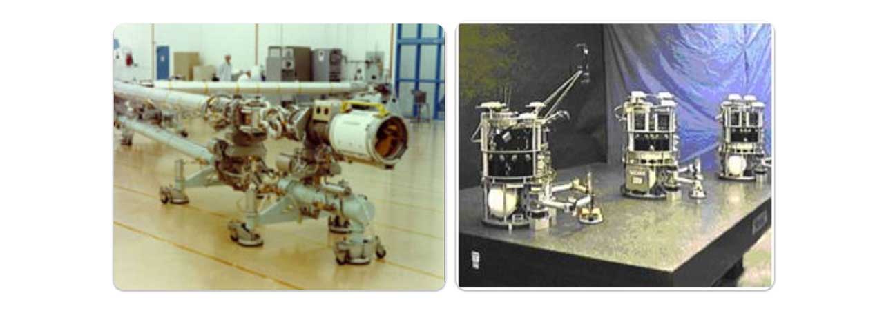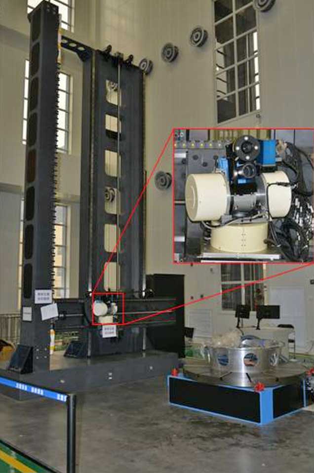 然而,安装总是有误差的,这些误差影响到航天器的控制和航天器的对地观测等应用。这哥们就是要完成对敏感器安装误差的标校:每个敏感器的坐标系由一个立方镜代表,这个设备通过视觉辅助和准直光管准直测量敏感器三个正交面的法线方向,从而确定敏感器的空间坐标系。该设备主要结构也是天然花岗岩材料。
