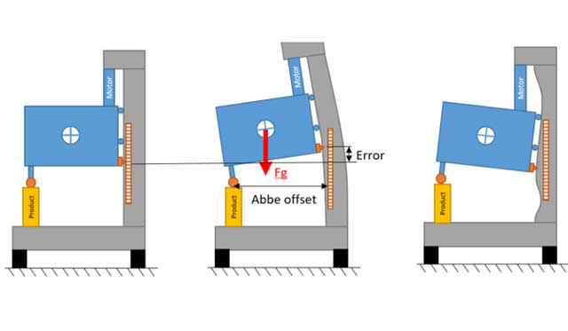 | 图 1. 传统制造机器的示意图。结构回路(橙色)、计量回路(黄色)和力路径(红色)通常重合,这可能会导致计量回路中的测量误差 [2]。 | 图 2. 计量回路中机械或热负载或制造公差引起的误差运动会导致测量误差(不确定性)。 |