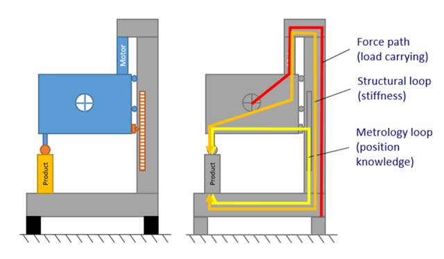 制造设备通常采用C形拱架结构,在目标点连接刀具和工件。C形拱架的刚度由结构回路决定,位置信息由计量回路提供。通常,这些回路在三维空间中(大部分)重叠,这可能导致计量回路的测量误差(见图1)。在高科技系统中,为了最大限度地减少不确定性,最好将回路分离并分配给系统的不同物理部件。